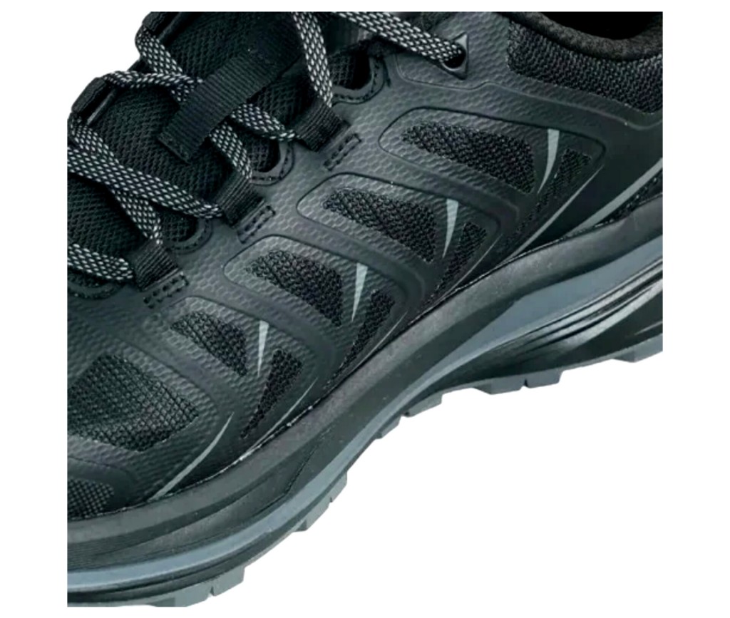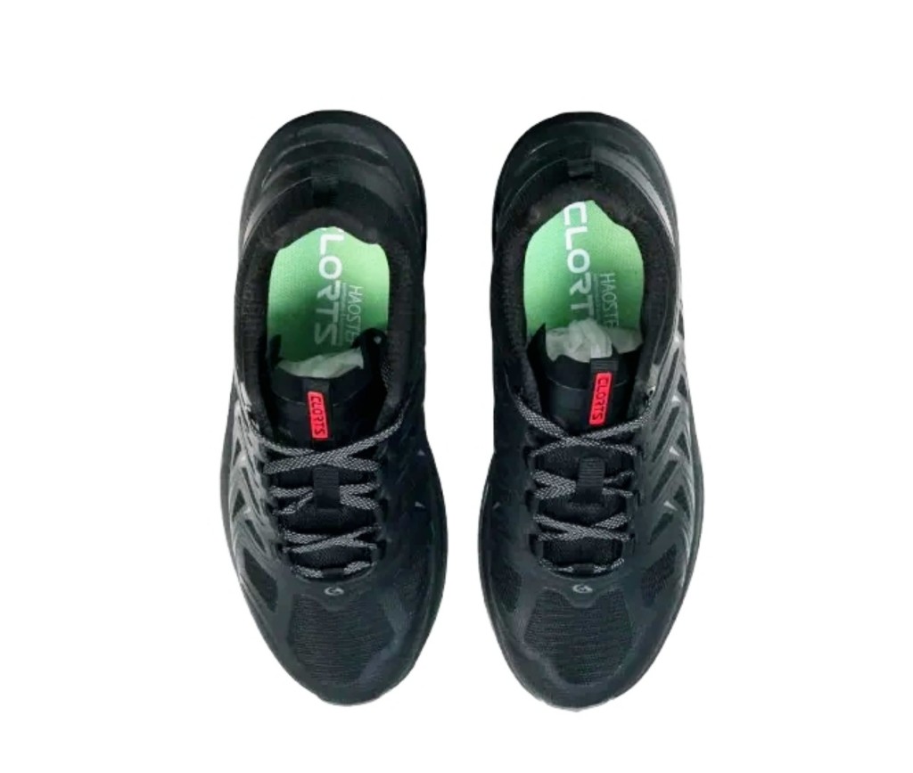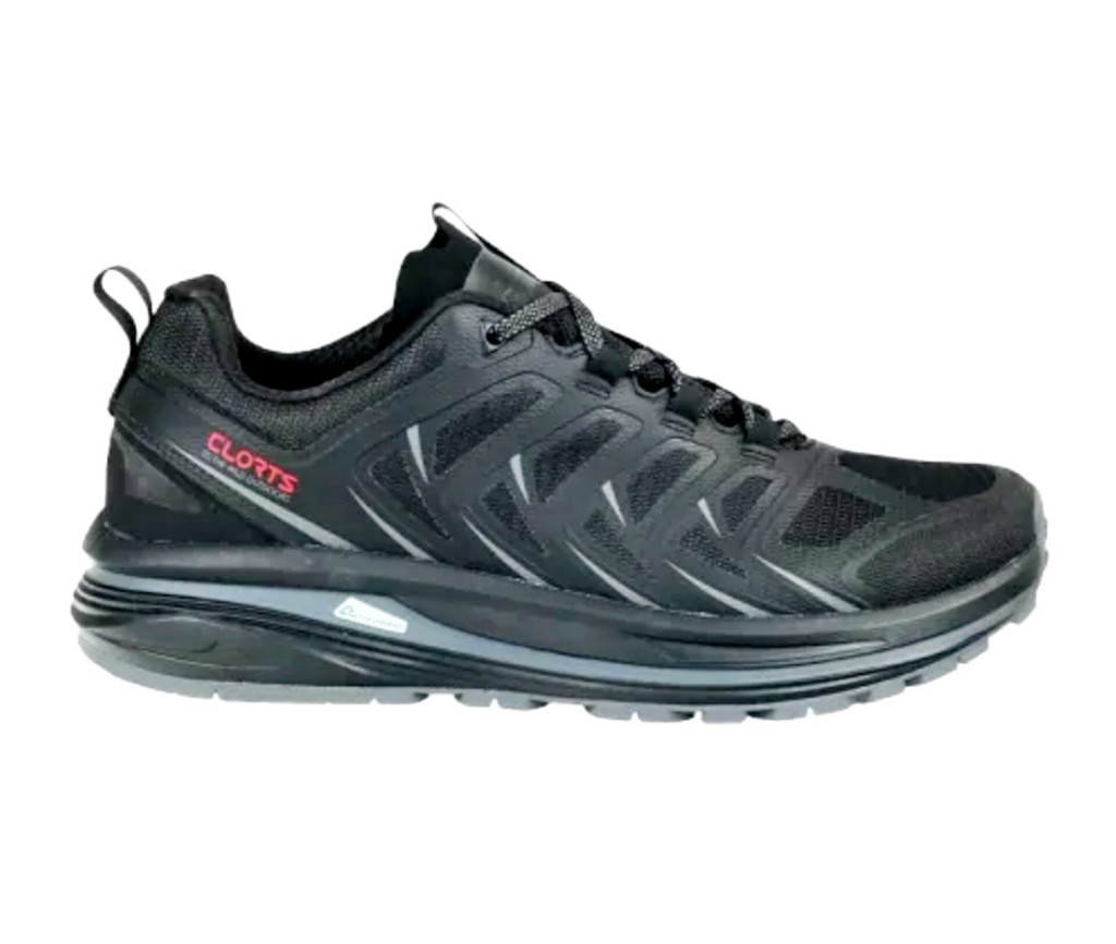 ظاهر ظریف اما قدرتمند این کفش را نمیتوان نادیده گرفت. ترکیب رنگ مشکی مات با خطوط خاکستری تیره در کنار لوگوی قرمز Clorts، جلوهای اسپرت و مدرن ایجاد کرده است. فرم پنجهی کفش به گونهای طراحی شده تا آزادی کامل انگشتان پا فراهم شود و از تاولزدن یا فشردگی در استفاده طولانی جلوگیری نماید.